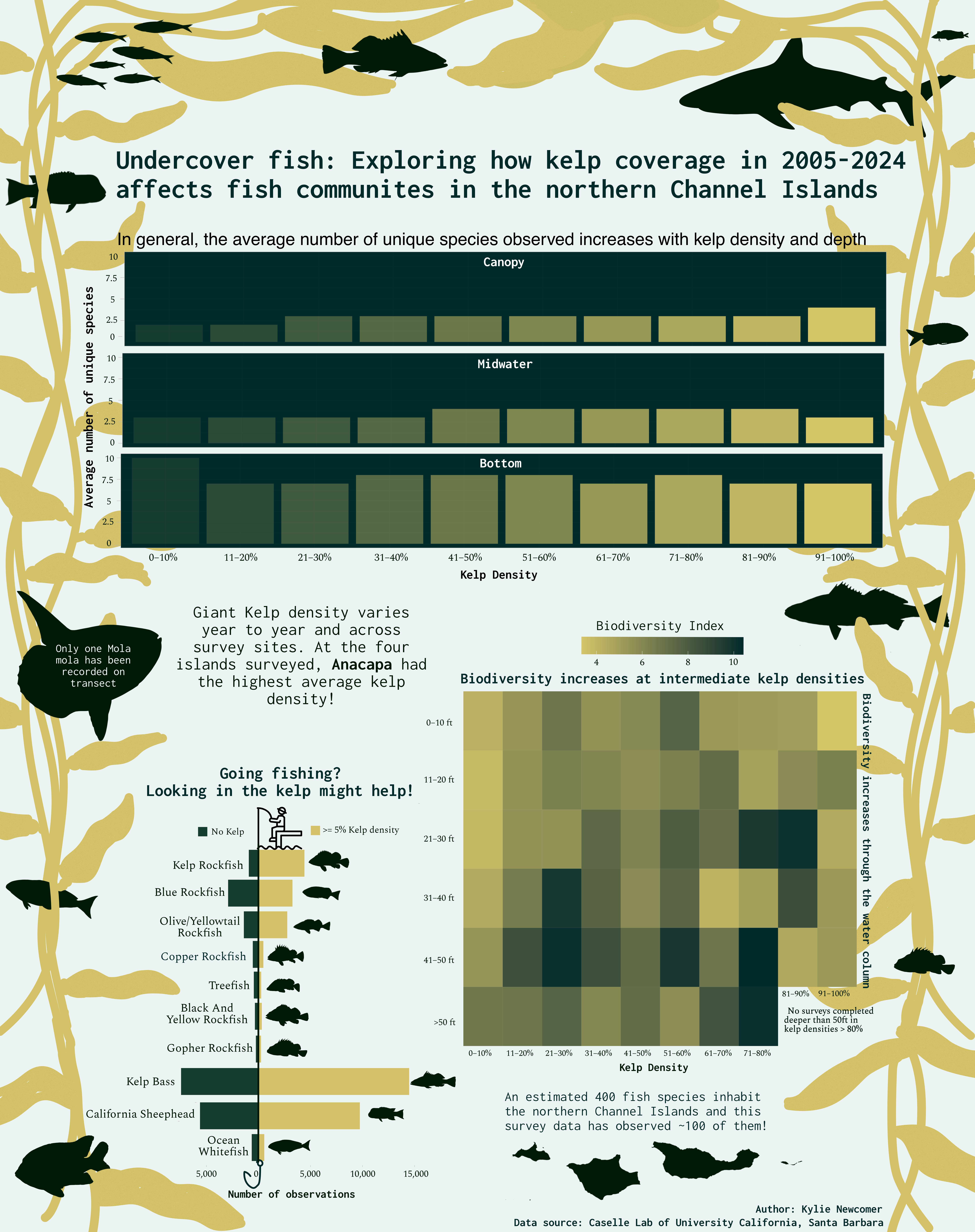 title = "On average, number of unique species observed increases \nwith kelp density and depth")