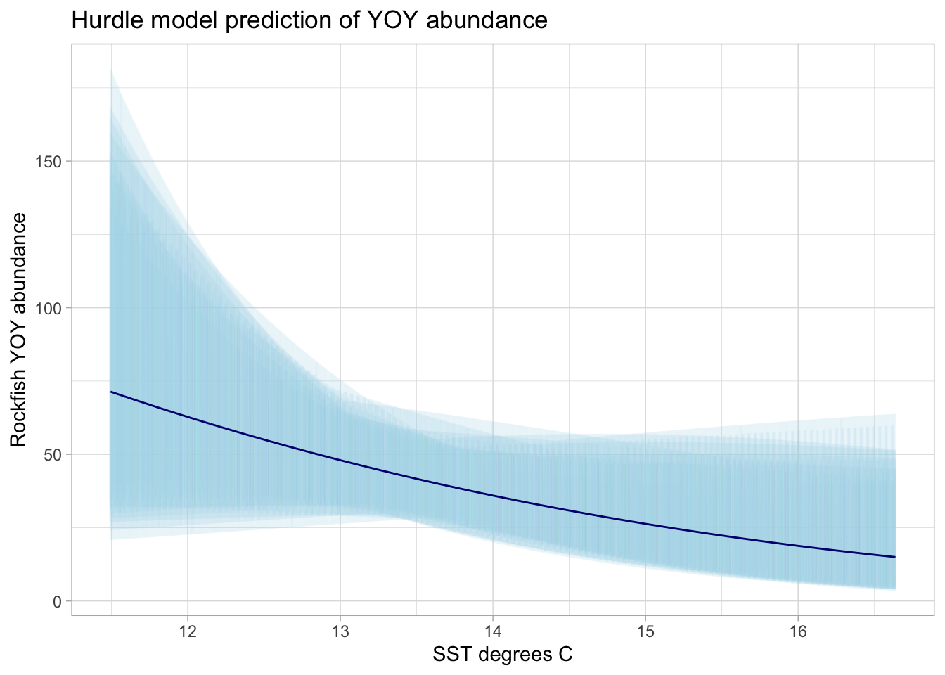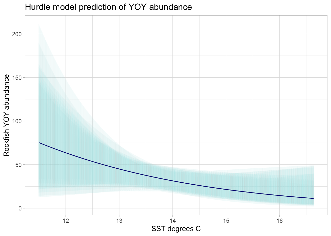 ggplot(boot, aes(SST_D30, count)) +geom_line(color ="lightblue", alpha =0.05) +geom_line(data = pred_hurdle_model, aes(SST_D30, count), color ="navy") +labs(x ="SST degrees C",y ="Rockfish YOY abundance",title ="Hurdle model prediction of YOY abundance") +theme_light()